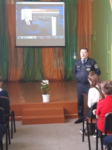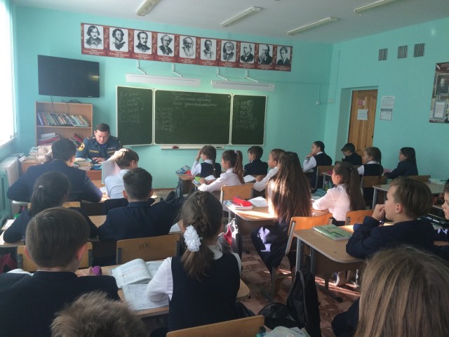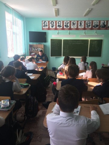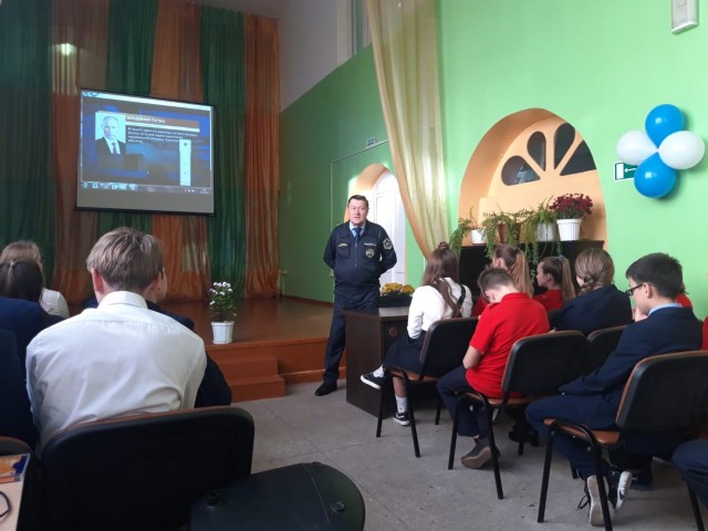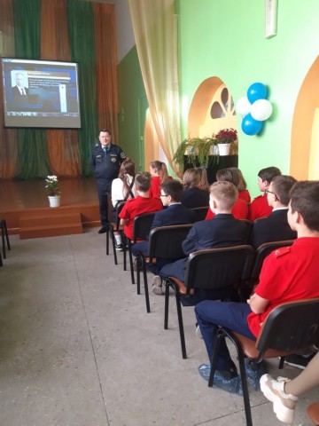 Начальник Управления гражданской защиты Калининского района Проскурин О.Н. провел беседу о безопасности жизнедеятельности. Начальник ПЧ № 35 Ценарев Р.В. рассказал обучающимся о развитии гражданской обороны.